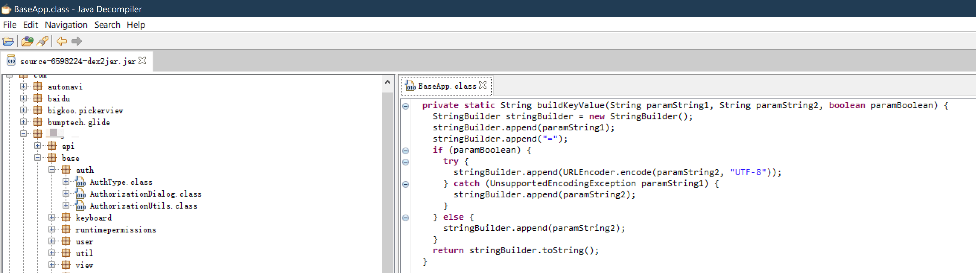 完成之后,正常运行要脱壳的软件即可。接下来访问 /data/data/<packageName> 文件夹,一切无误的话,应该会看到一个 dump 文件夹,里面就是正常的 dex 文件,复制出来,就能看到正常的源代码了。如下图: