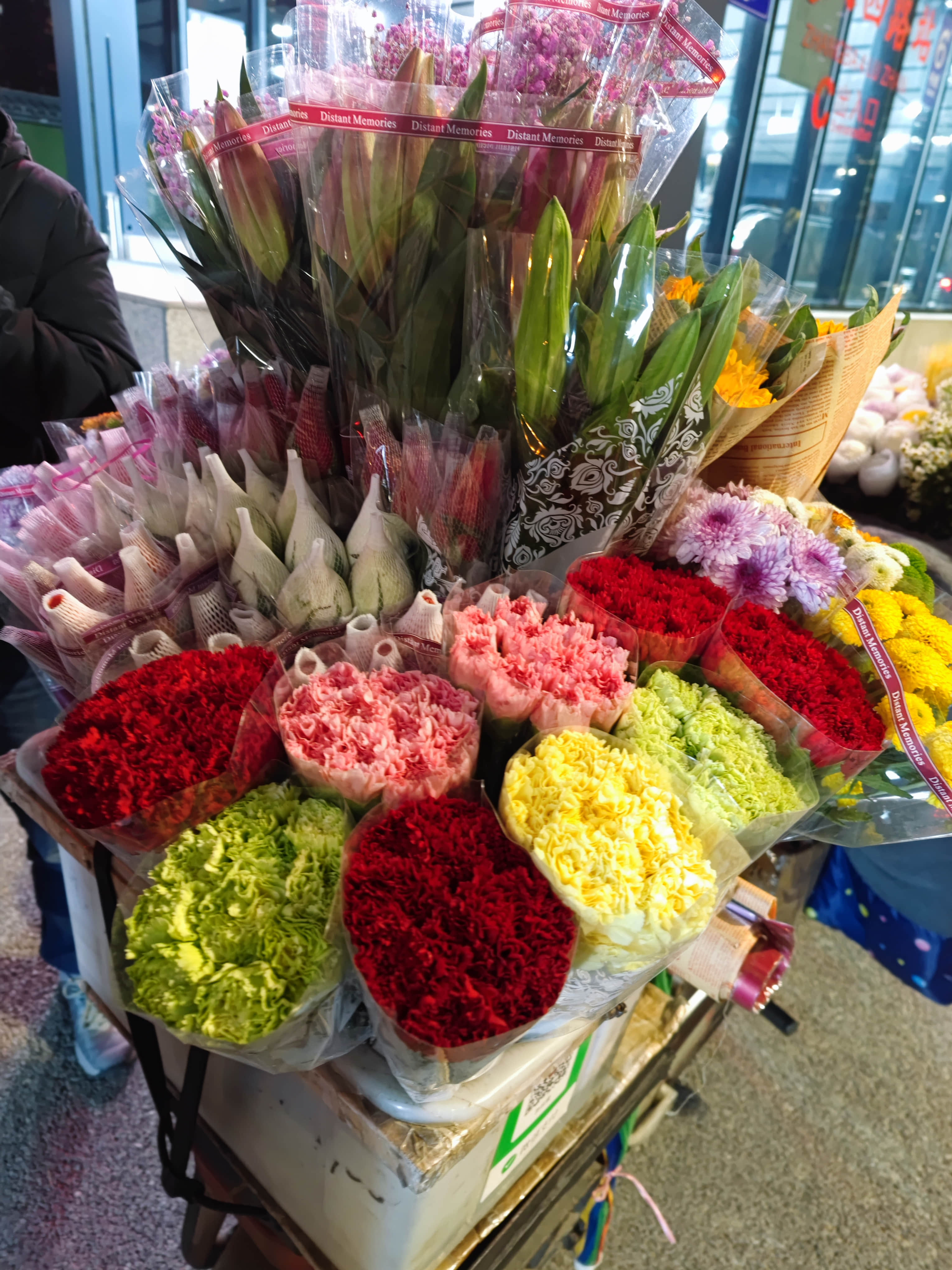 吃完之后和 luy 去找了另外两个也在外面吃饭的同学。不知道这天是什么日子但在地铁口看到了卖花的。luy 就仔细琢磨起来买一束什么花,的确像是他能干出来的事情。