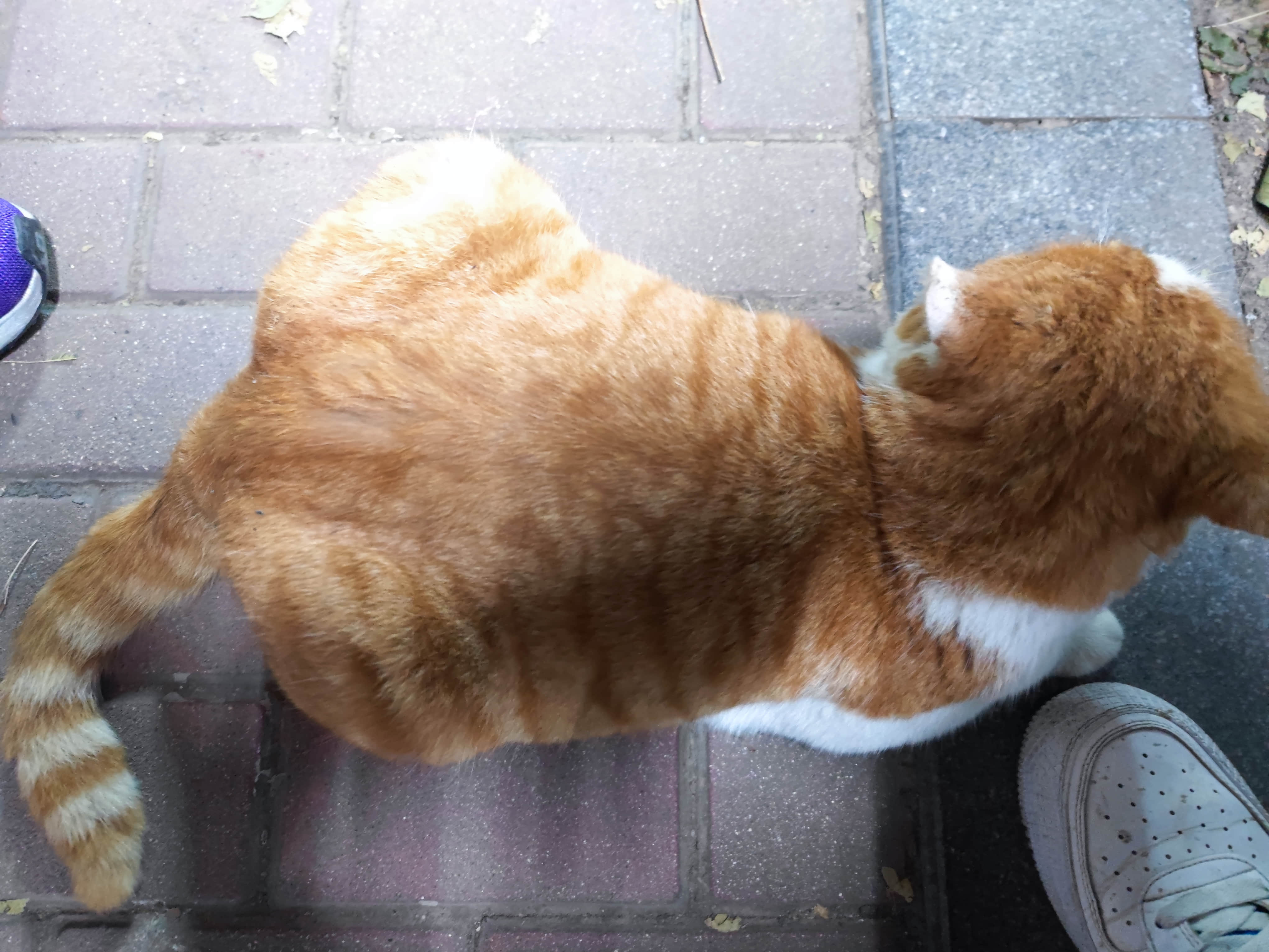 回学校之后跟水水在学校里遛弯,在宿舍楼下遇到了一只橘猫。印象中一个月之前这猫还挺瘦的,现在怎么这么胖了。