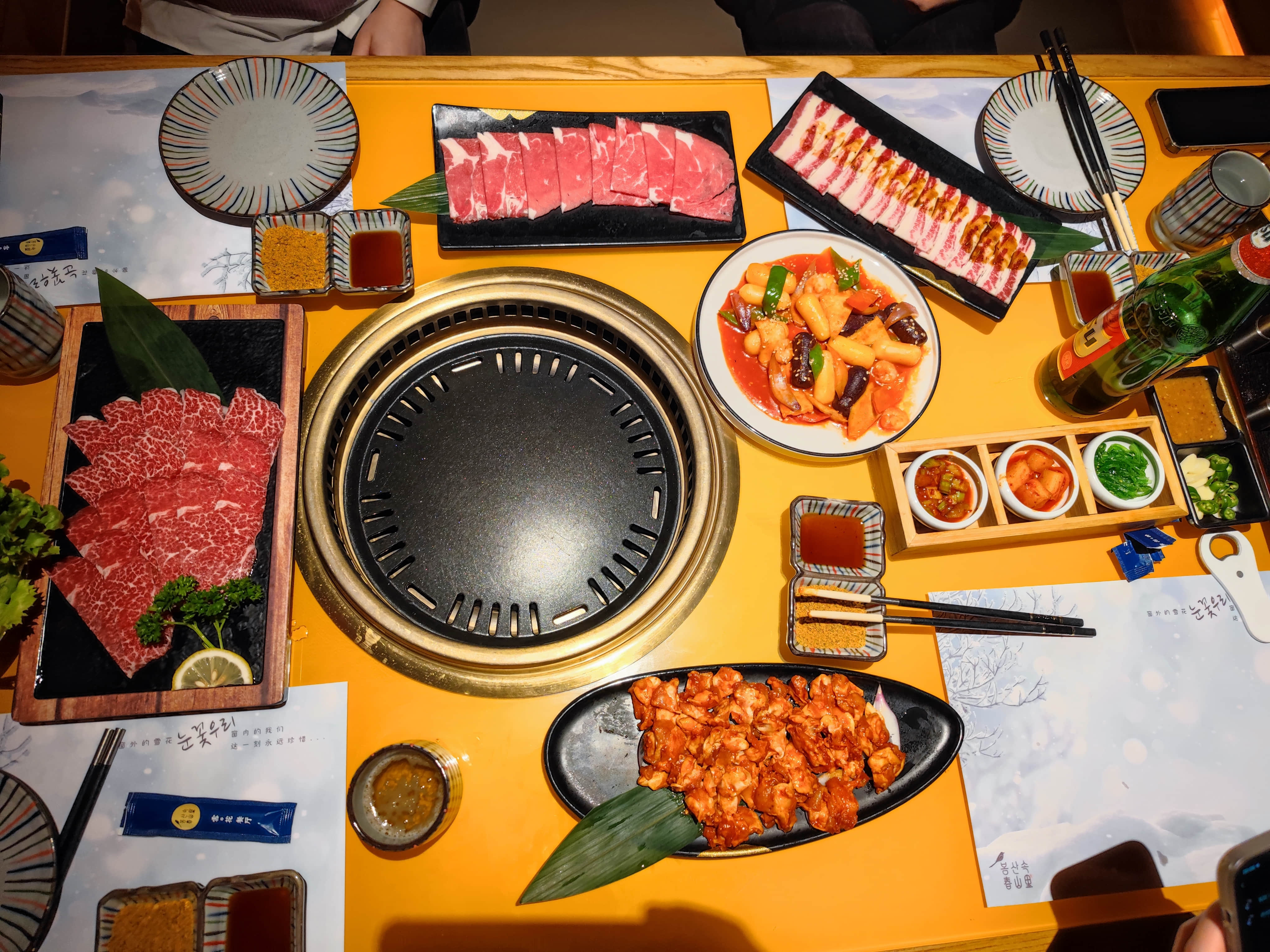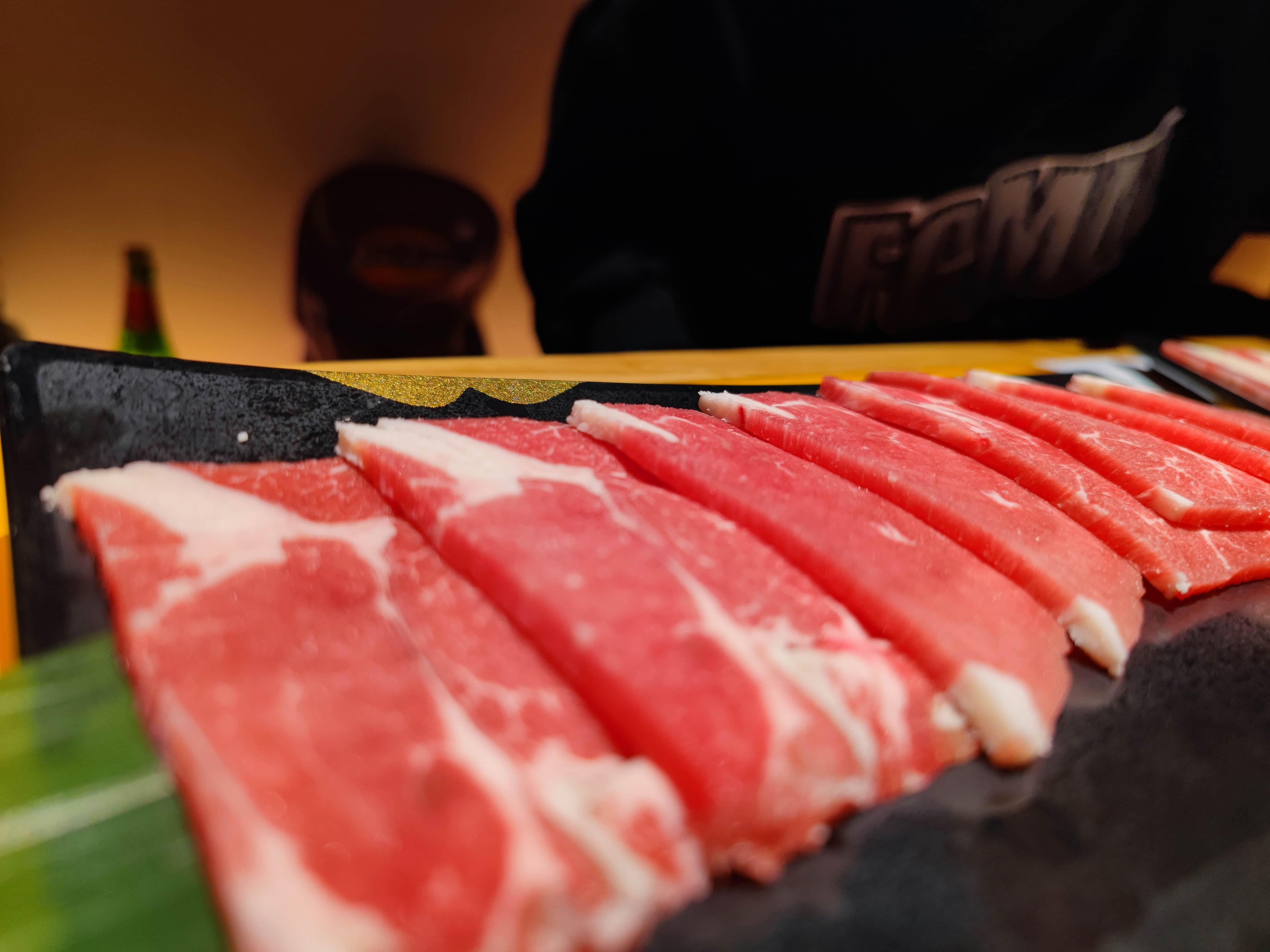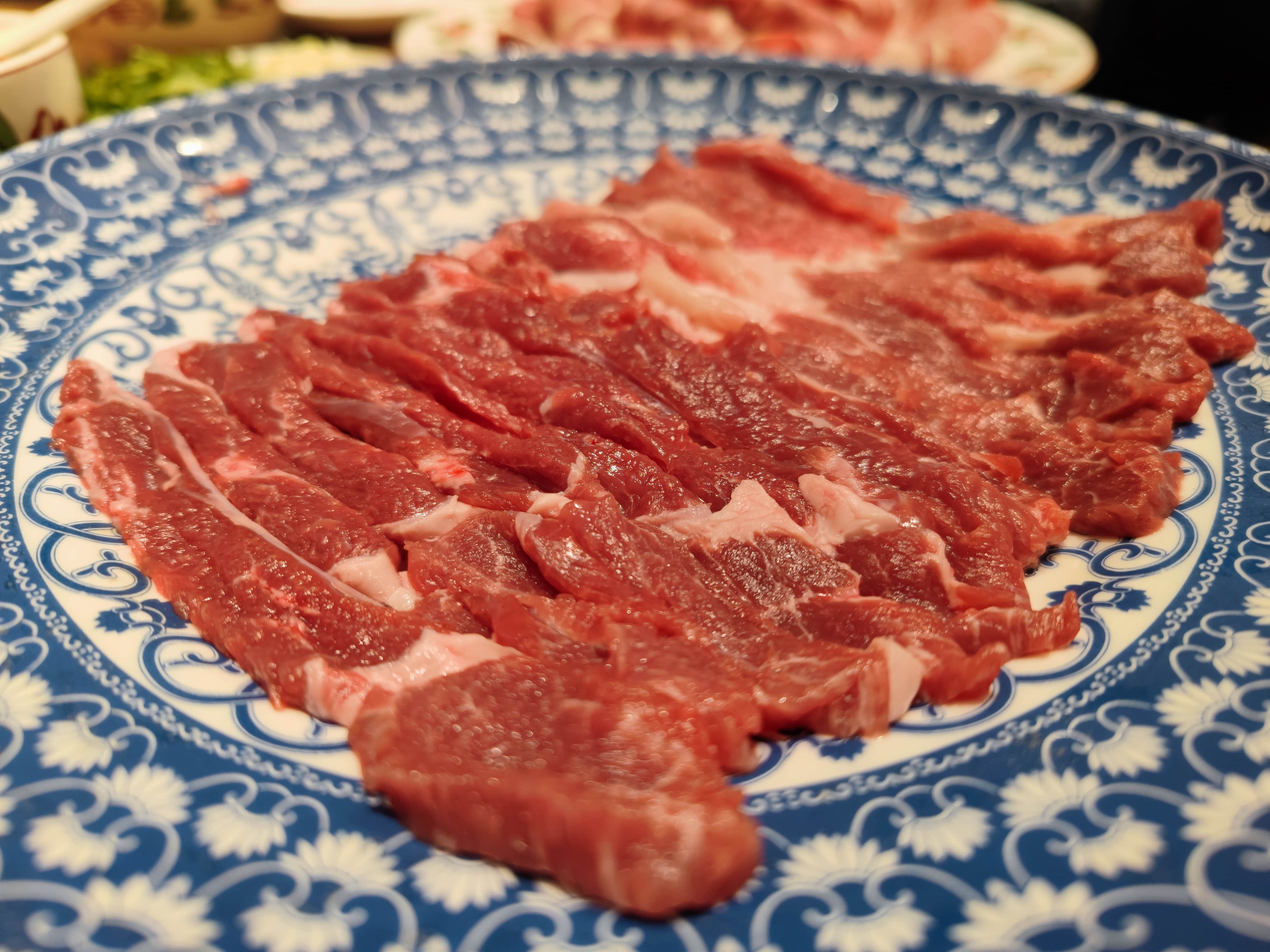 卷卷、书记、🐟他们先到,剩下的包括我在内的人则后到。一进店门我就被卷卷架到书记旁边坐下。整个吃饭的过程中我和🐟一直觉得书记像个可爱的小孩一样,按照🐟的说法,“感觉像是养了个儿子一样”。书记调的料碗里加了超级多的芝麻酱,本来他说是给我调的,还加了三大勺小米椒,被我用我亘古不变的蒜蓉香油碟严词拒绝之后就自己吃了。因为他料碗调得非常满,蘸肉的时候芝麻酱就会溢出来,搞得碗壁和他面前那一块桌面上到处都是。然后他还会自言自语自己吐槽。不禁让我想起来大一整个宿舍去杭州玩的时候,有个舍友可以说是第一次坐飞机,全程也是跟小孩一样各种好奇和惊叹。所以有时候人的性格和风格是很神奇的东西,平常看着是一个样子的人,换了一个环境就会有另一个样子。