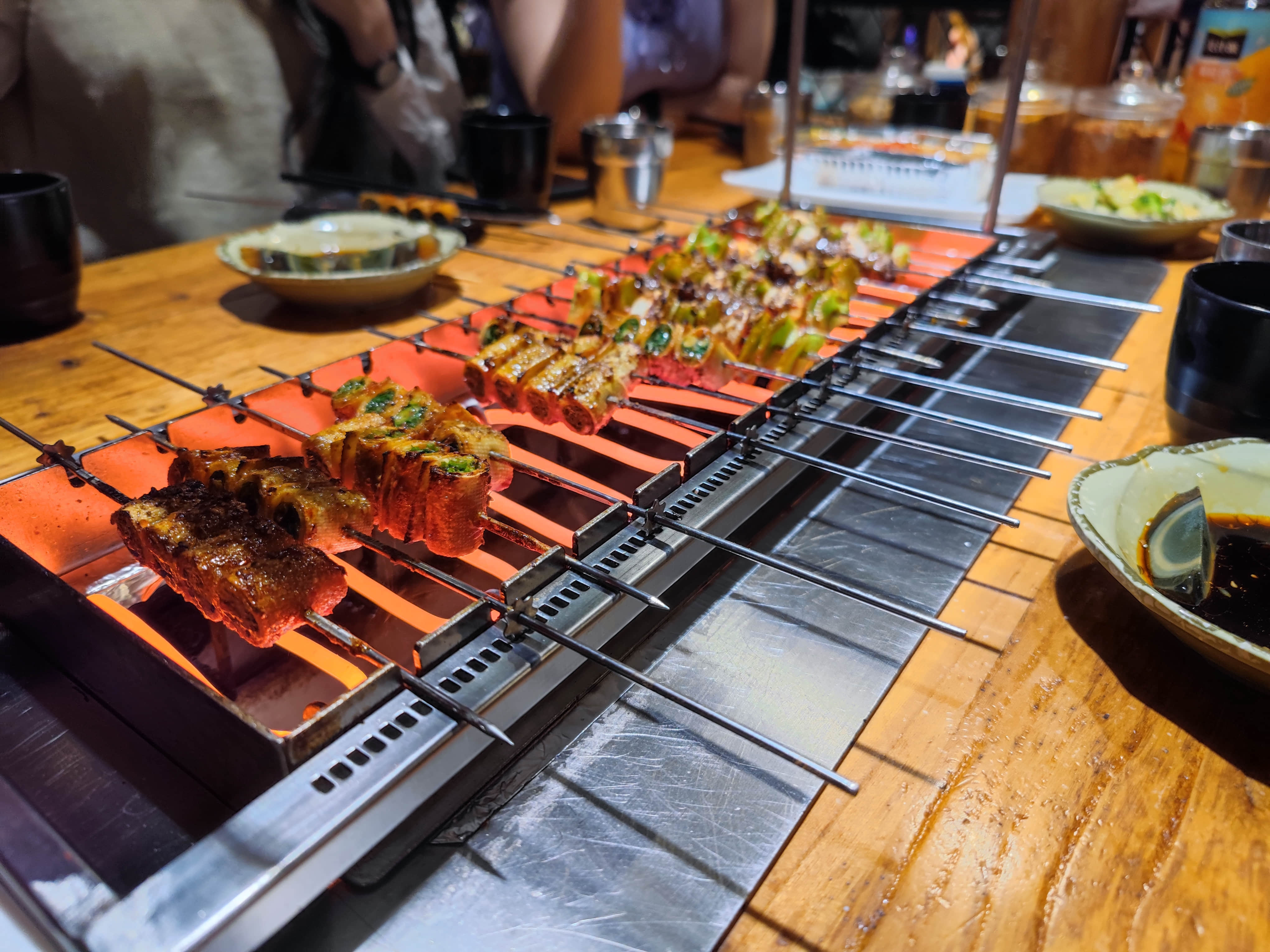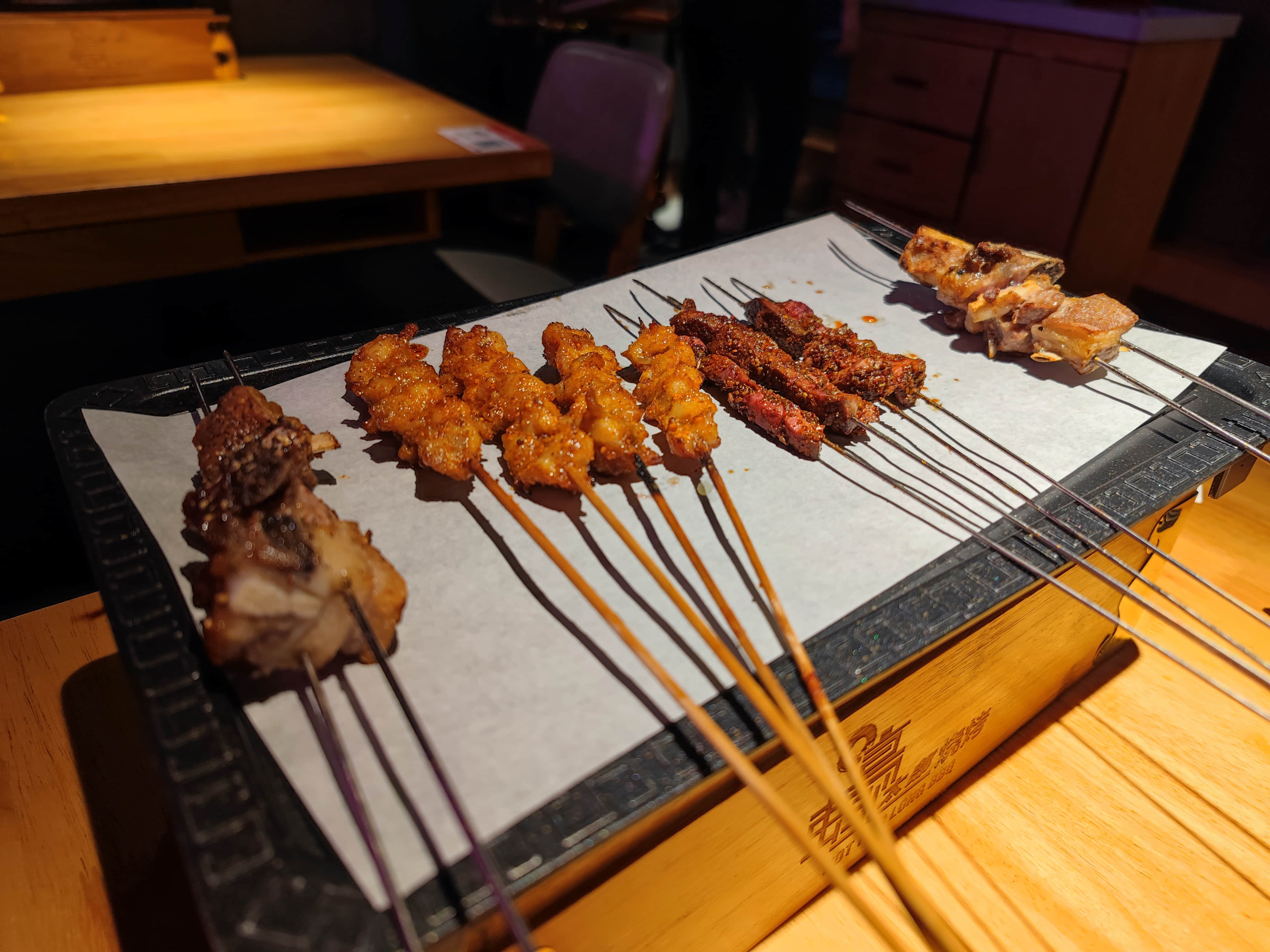 从 JD MALL 出来刚好是晚饭点,在吃什么这个问题上纠结了一小会儿。然后我看到对面有一家木屋烧烤,查了下是在这边开的第一家店。在北京的时候经常和同学来吃,感觉还可以。就拉着水水一起去了。因为是周末,前面排队的人还是稍微有点多的,取了个号转了会儿才到我们。