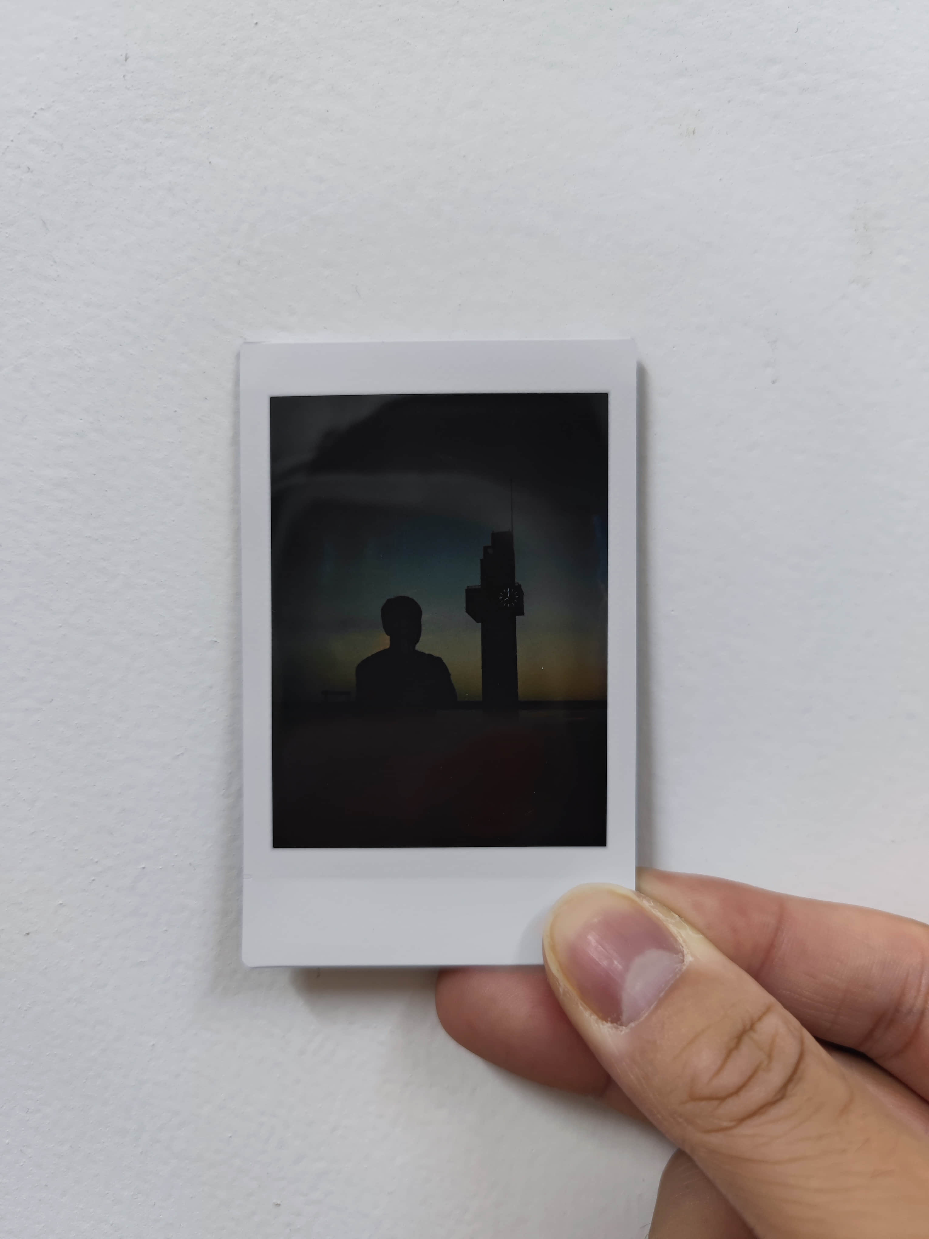 大概是好不容易又等到一个上天台的人吧,这个同学就让我帮他用他带的拍立得拍人像剪影。对摄影技巧一无所知的我,也不知道最后帮他拍出来的照片算不算废片。他也送了我一张拍立得。该减肥了。