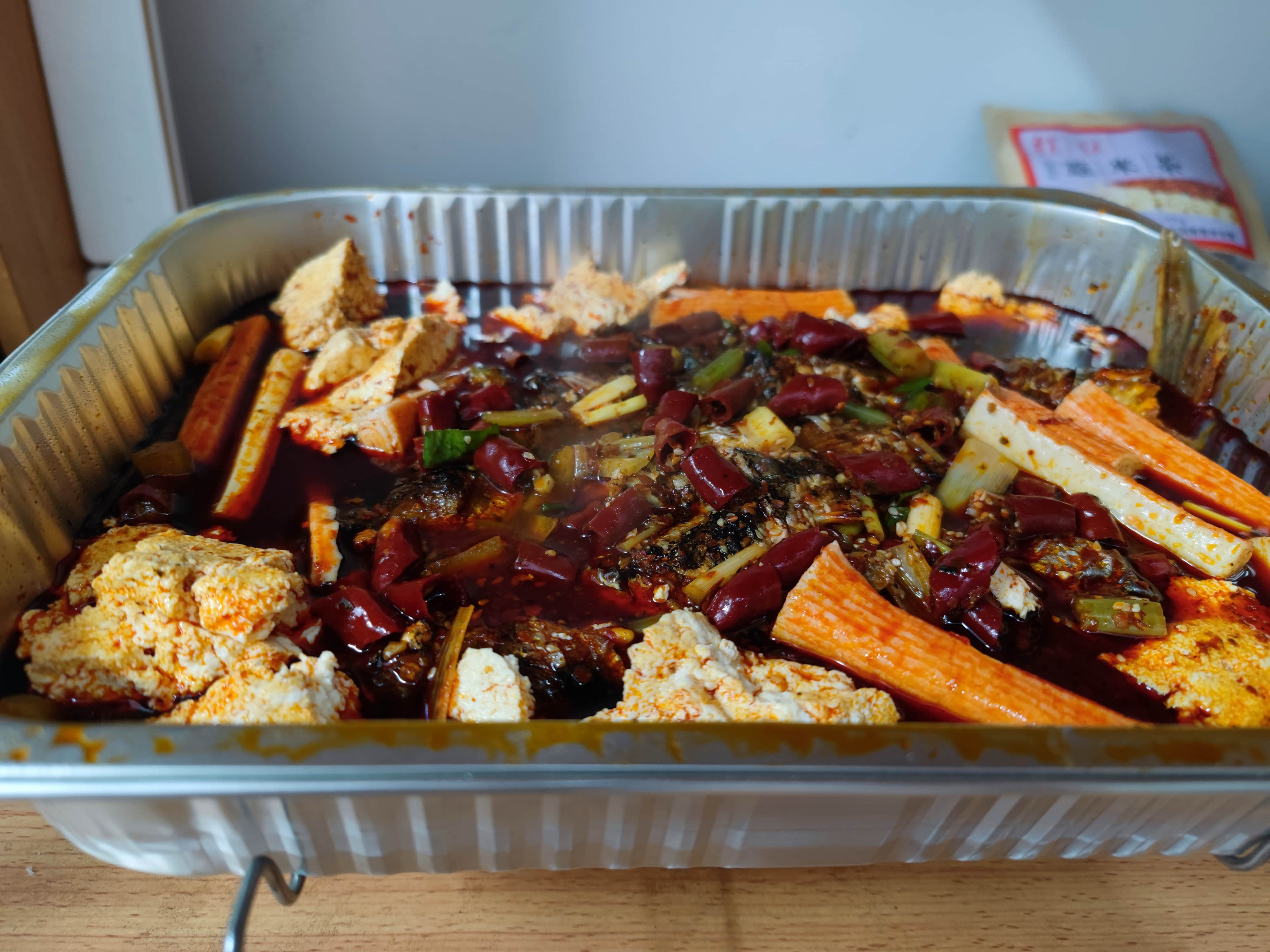 看起来东西还是比较多的,两个人吃得还算饱。美中不足的就是,舍友因为太困,在点了外卖之后就睡了过去,导致小哥给他打的八个电话都没接上。小哥最后直接把外卖放在了校门口。由于放了很长时间,所以拿回来之后已经不怎么热了,就连酒精小烤炉都没能让整个锅沸腾起来。