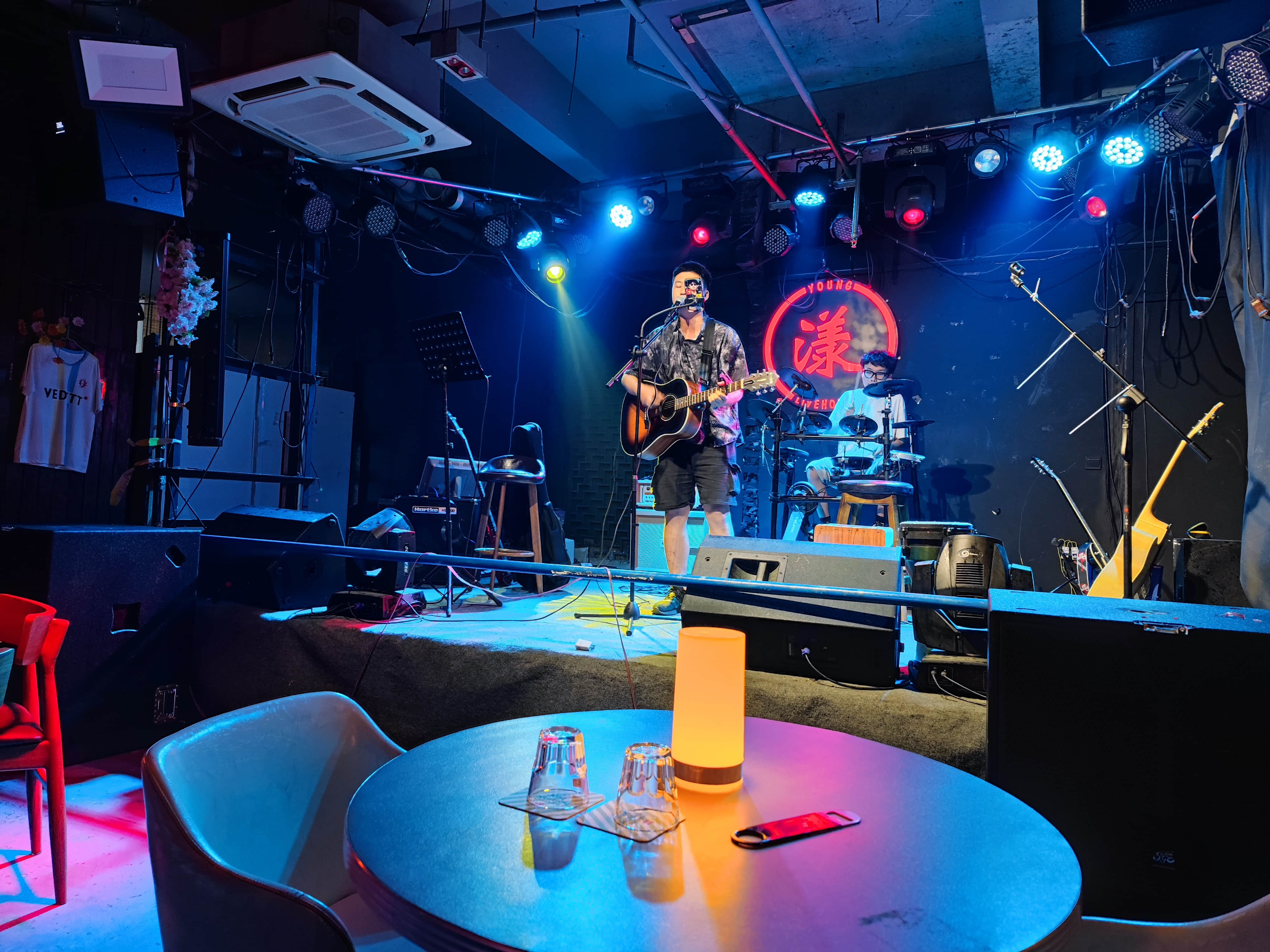 吃完饭之后大家去了酒吧。本来我是想推掉的,但实在盛情难却。这家酒吧还算是个 Livehouse,刚好晚上还有驻唱歌手。