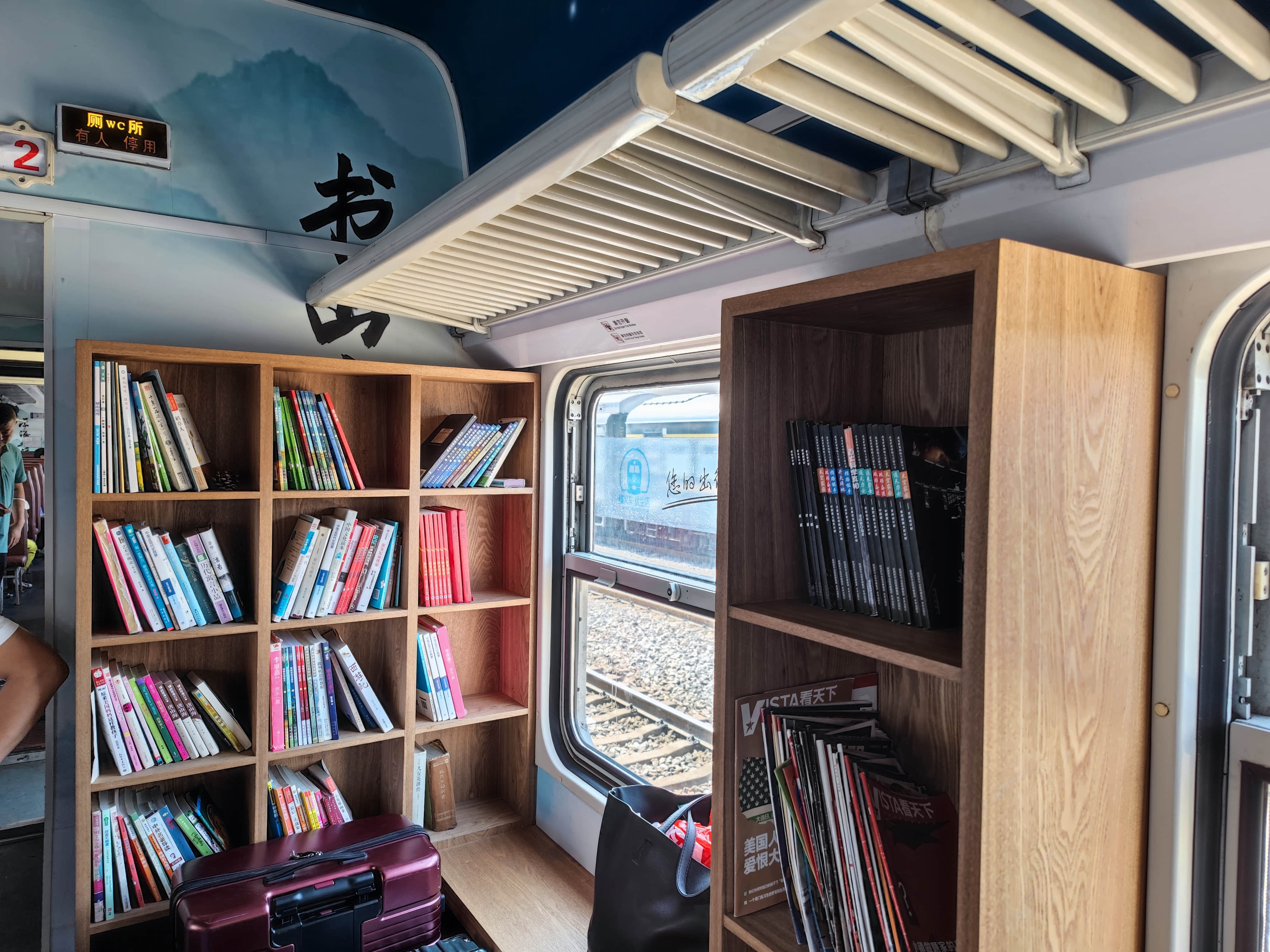 和书记买到的票是 2 车“通学车厢”,看起来是平常属于上下学的孩子们的空间。靠近一端车门的位置有一排书架,上面放了各种图书。之前在纪录片中有看到,很多慕名前来乘坐这趟小慢车,和一些志愿者们会捐赠一些图书,供车上的孩子们阅读。在书架上发现了一本 2018 版的近代史纲要,有那么些怪。