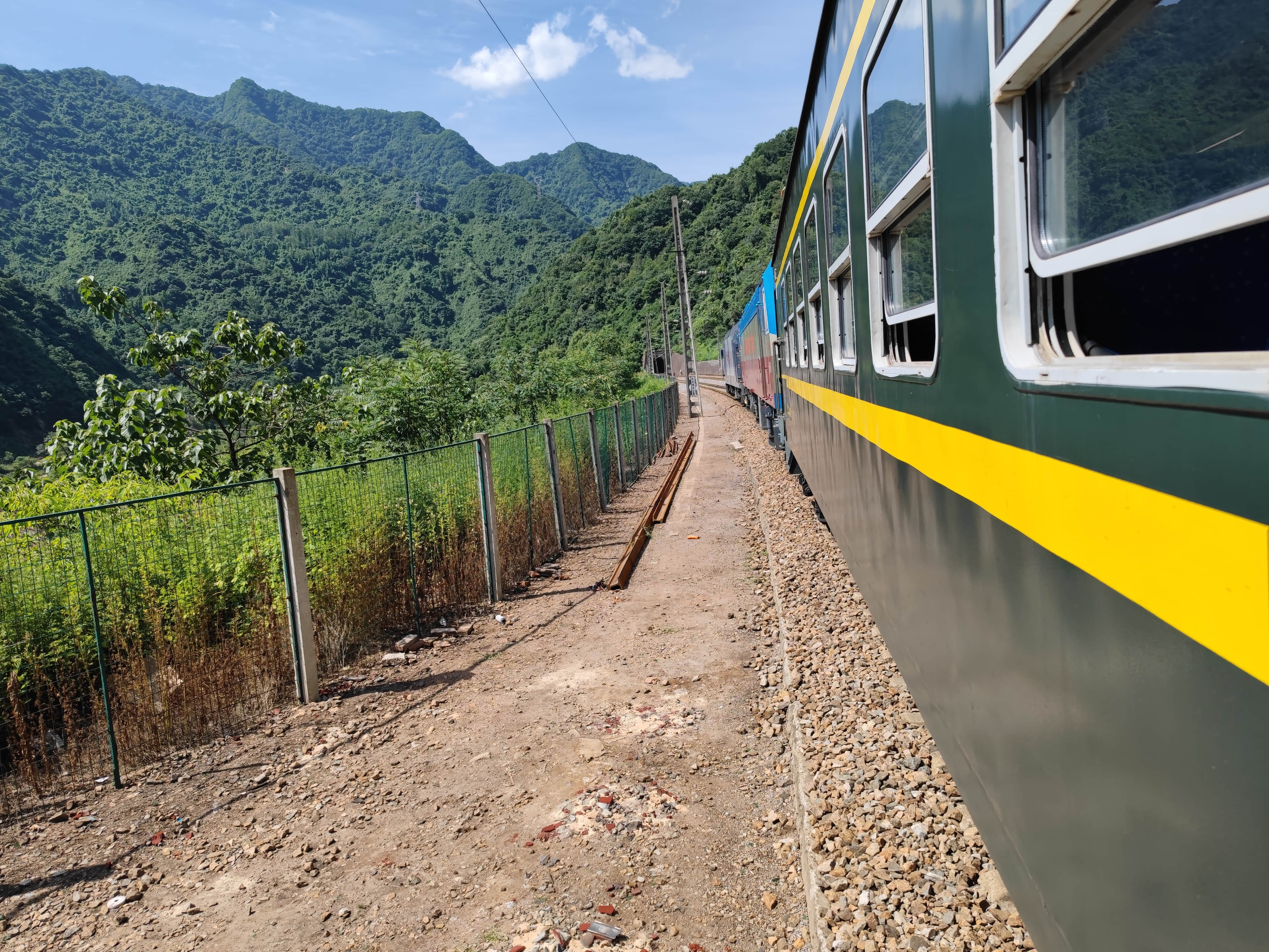 车厢里的人并没有坐满,所以为了能不和其他乘客挤在一起,我们换到了两人座的一边对着坐,刚好还有地方放包。书记不太想被晒着,就坐到了面向行车方向的一边。在背向行车方向的这边,虽然不能看到机车,但因为位处第一节车厢,所以在转弯半径比较大的时候可以看到直到车尾的整列车,以及后面的线路和隧道。
