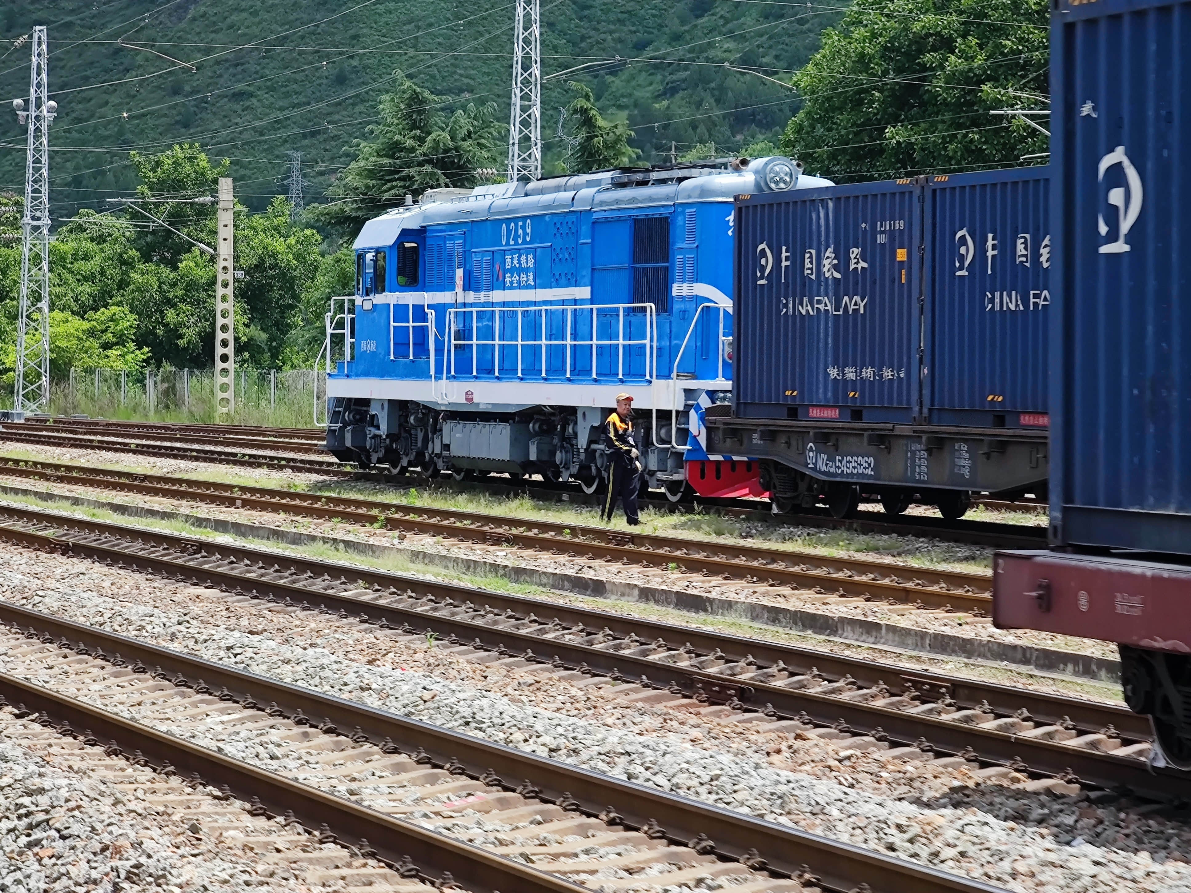到车站附近的时候其实还有比较长的一段时间才发车。看了下地图决定带书记到车站旁边去拍车,不过走过去才发现有围墙。也能理解,车站附近的客货运线路不是那么好接近的。我们只得站在一个陡坡上向下拍。这两节机车还比较有意思,后面会再次提到。