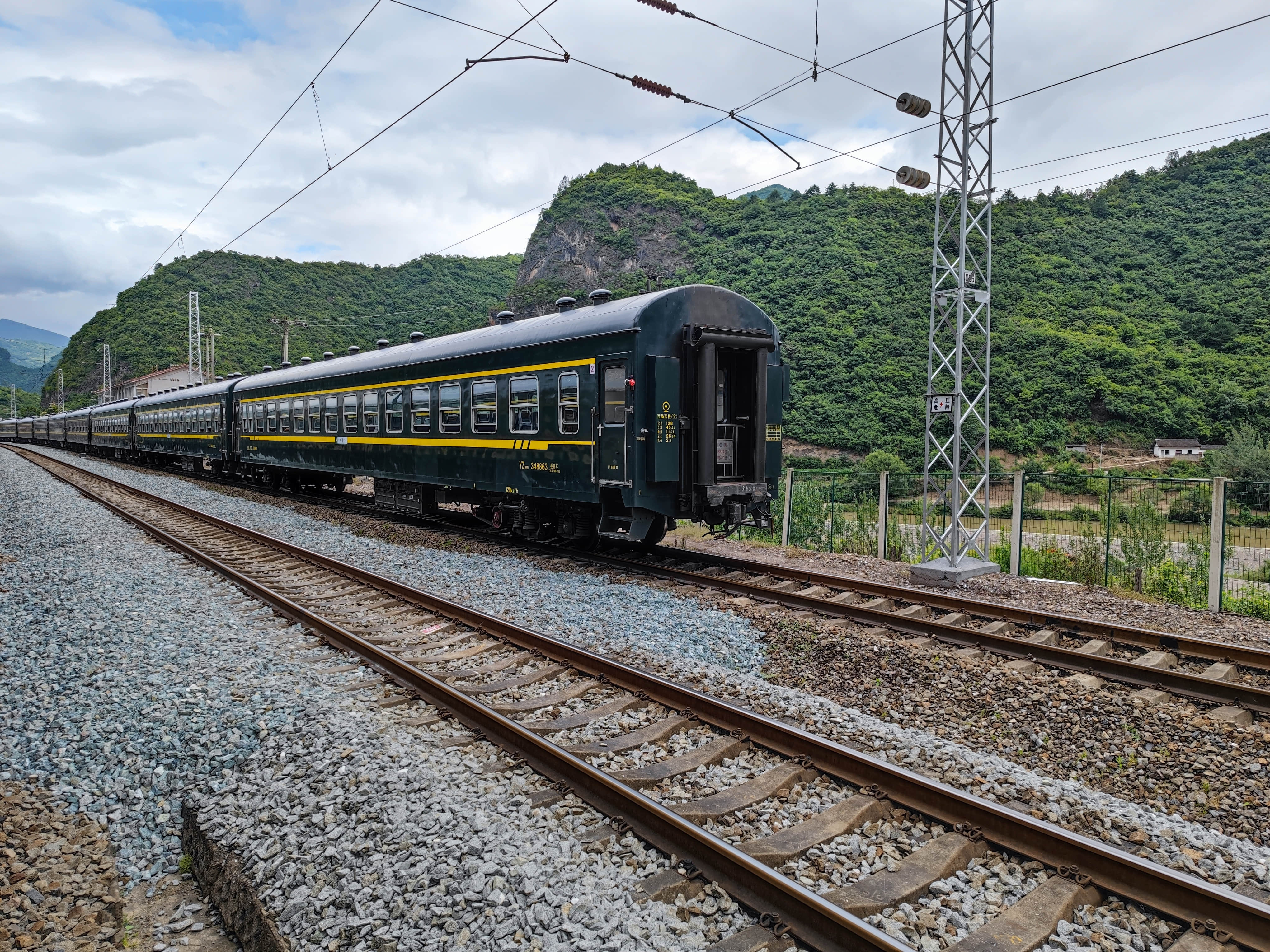 大概四点半左右的时候,6063 在一个隧道口停了下来,看来又要待避了。习惯性地听见对向鸣笛后用手机摄像头辅助看看是什么车,惊奇地发现居然也是一列客车。一边叫书记也过来拍,一边赶紧切换到录像模式。仔细一看水牌,成都到北京西,那看来是 T8 天府之星没错了。本来打算第二天回去的时候坐这趟车,但书记觉得同一条线路再看一遍没什么意思,加上卧铺白天也不好玩,就作罢了。