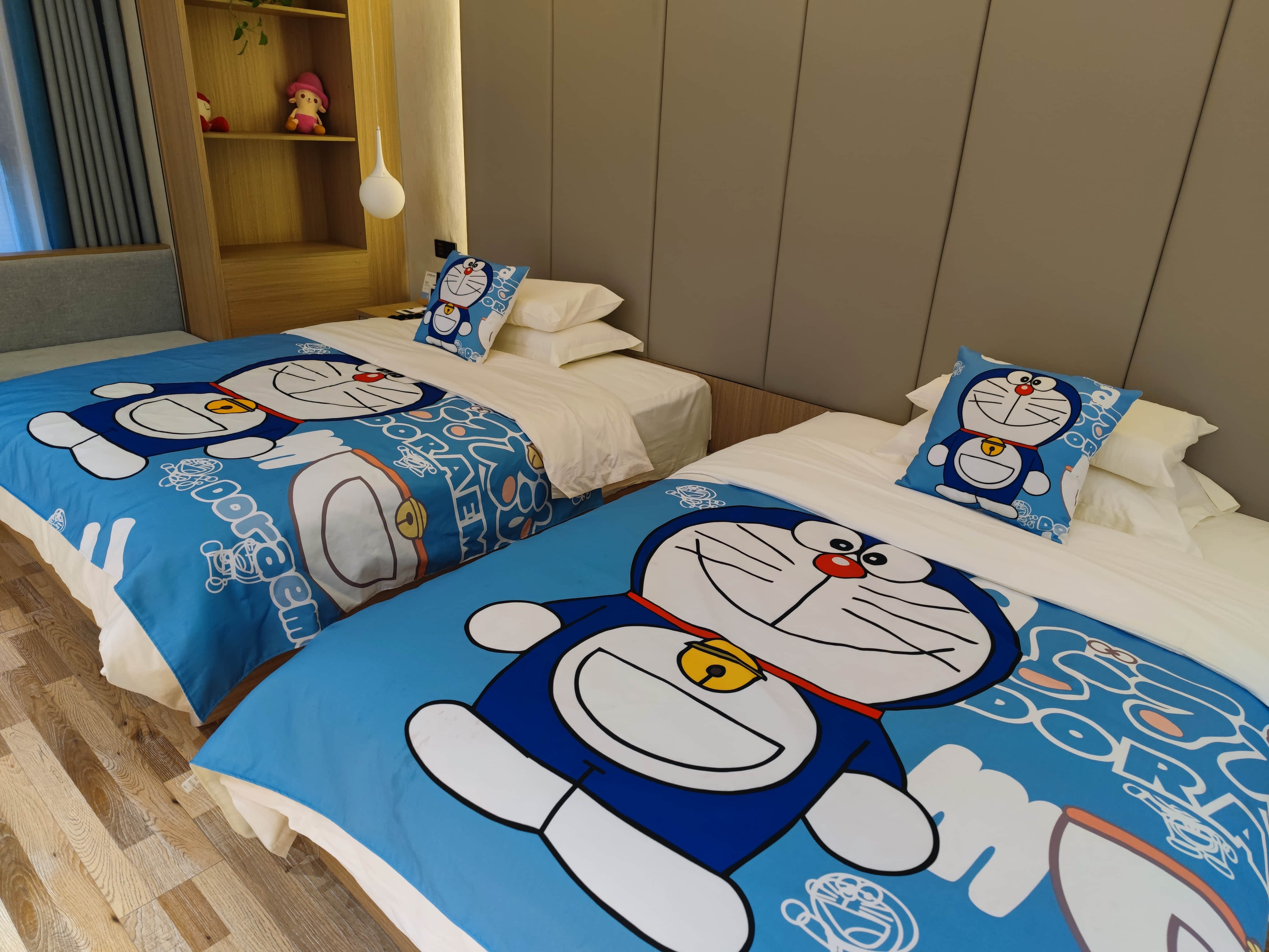 到了酒店办理入住手续,前台说升级了一个大点的房间。上楼开门看的时候发现确实空间比较宽敞。至于床上的物件,还比较神奇,画着哆啦 A 梦。不知道有没有版权。