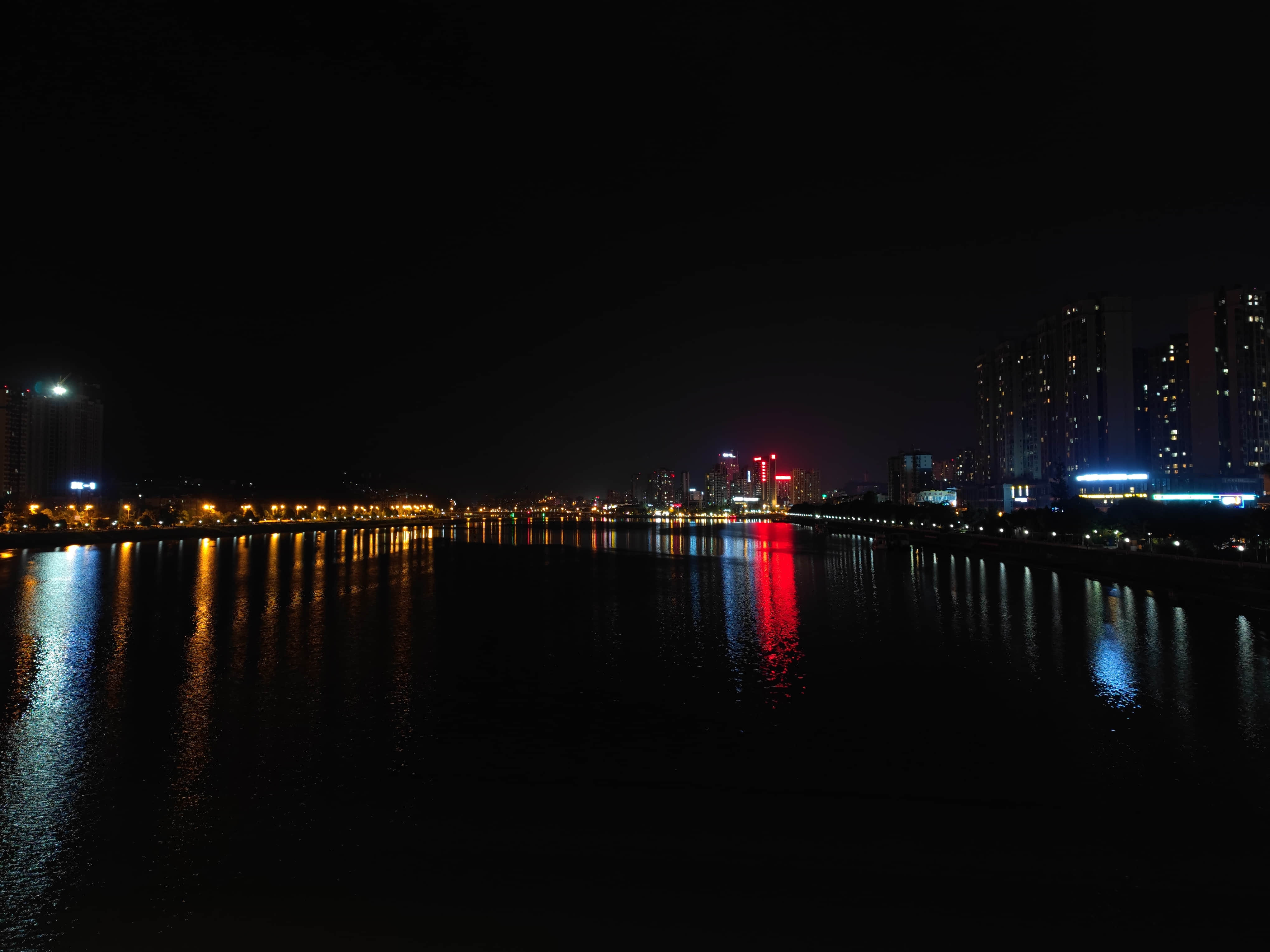 小城市晚上路上没有什么人,也没有什么夜景。不过走到一处跨越嘉陵江的桥的时候,发现远处的灯光还不错。