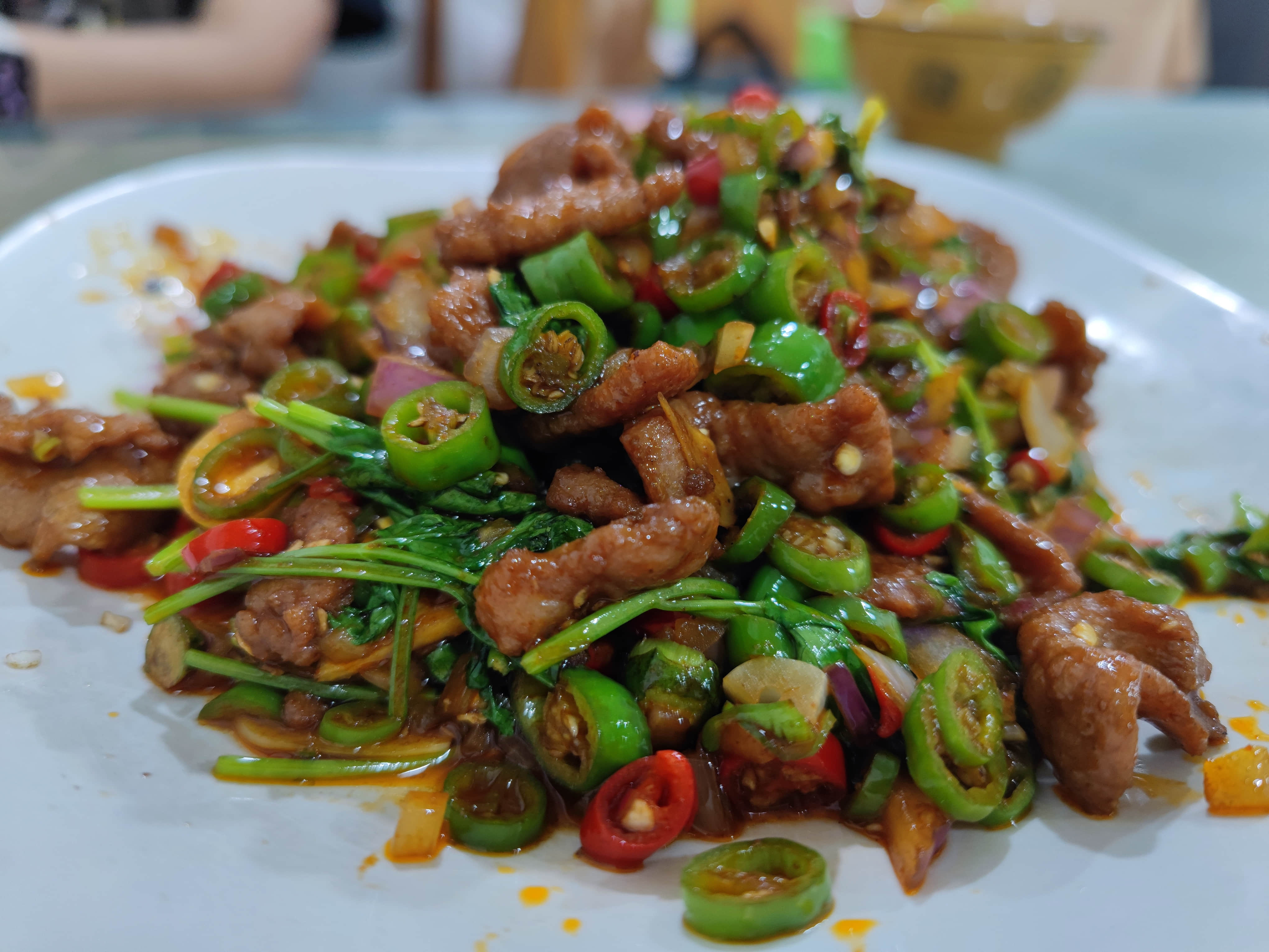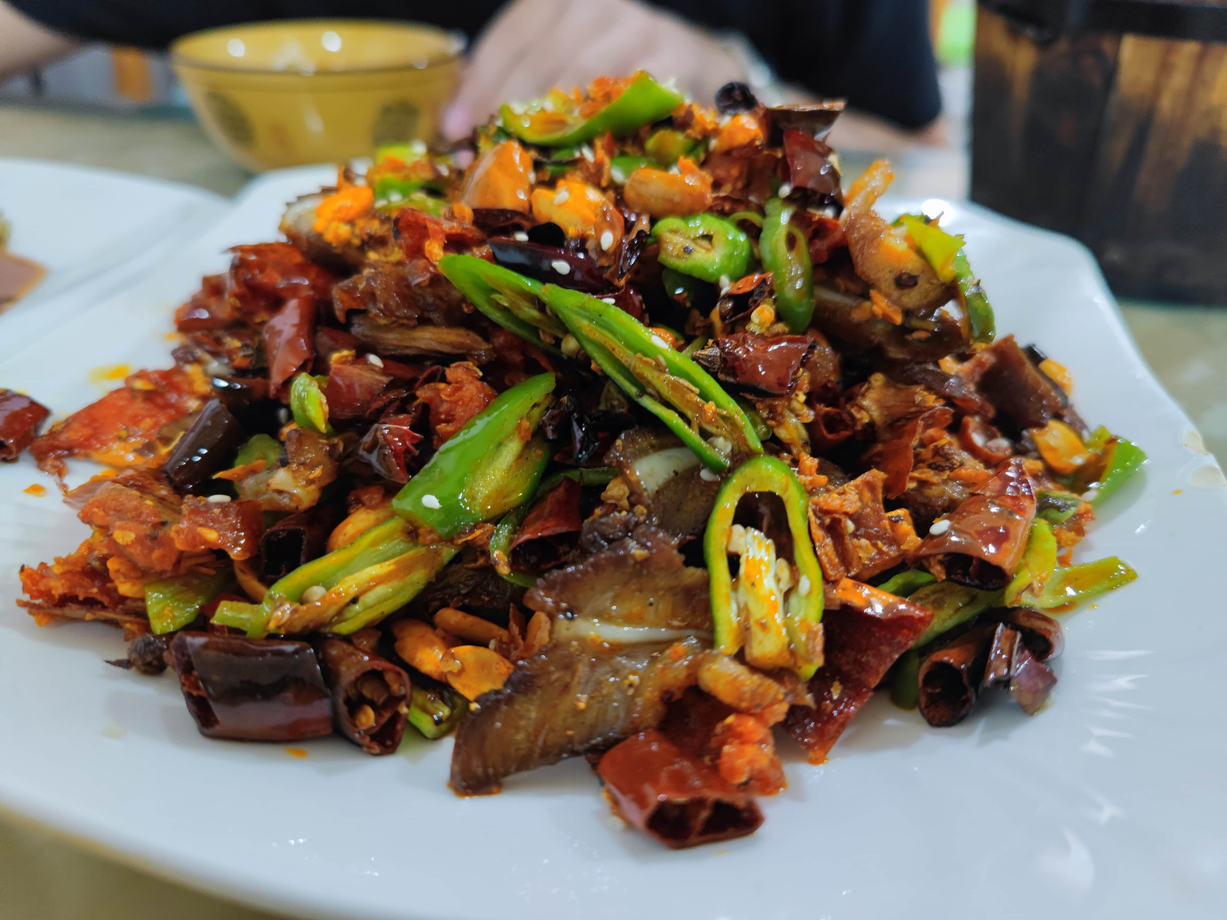 拍完之后继续往目的地饭店走。当我们到了的时候是下午两点多了,这家店已经不营业了。无奈之下只好在旁边随便找了家还开着的家常菜馆。书记说想吃变态辣,翻遍菜单选了两个我觉得应该会很辣的菜。不过最后并没有能辣到他。