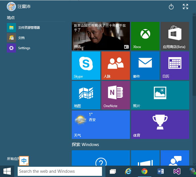 9926 最大的变化之一,就是在任务栏加入了搜索框。如果将系统的区域更改为美国,就能够使用 PC 版的 Cortana,否则作为普通的搜索框使用。